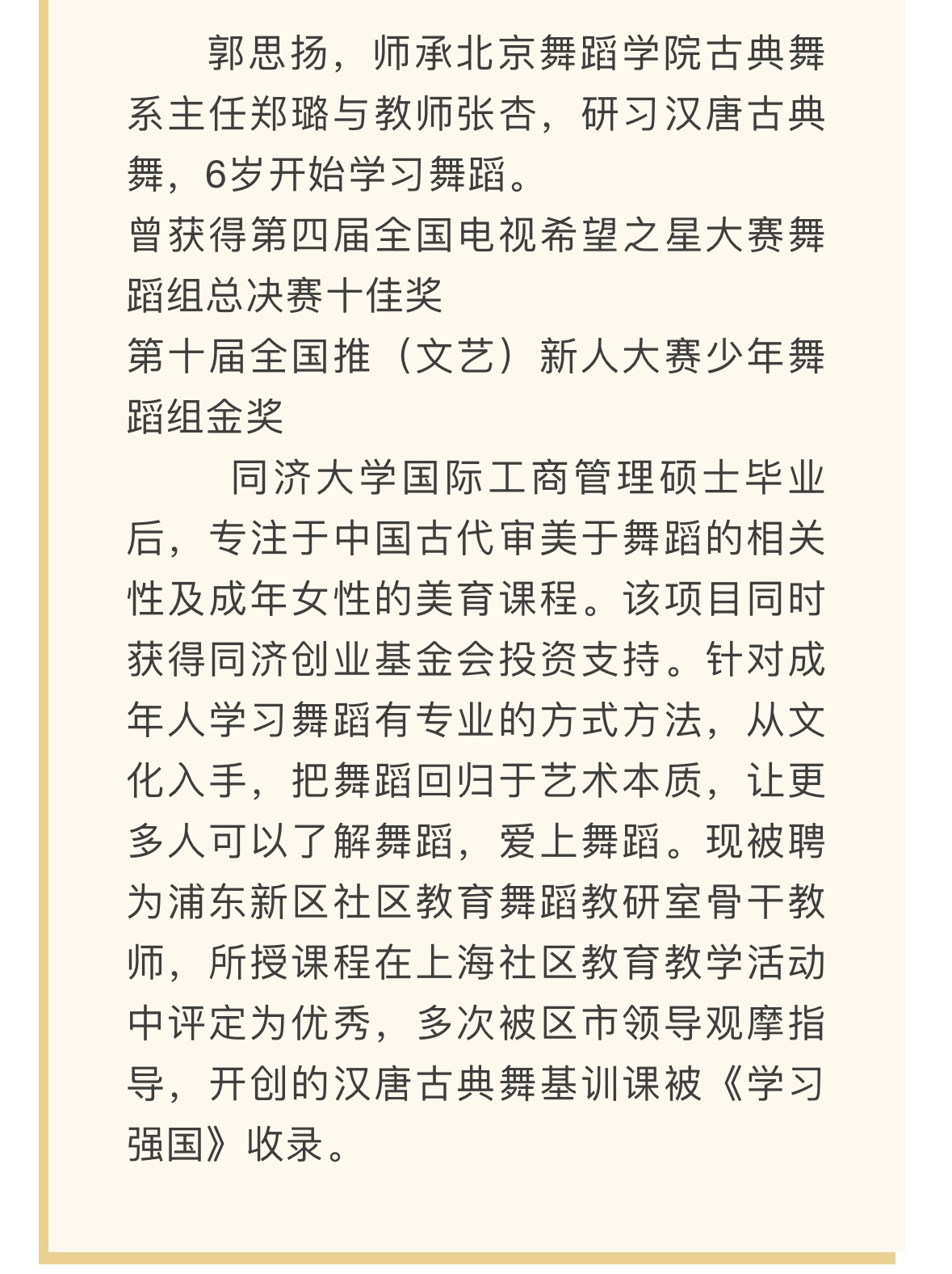 2、结合传统经络养生训练中国古典舞需要的腰腿能力,在修身养性中把握中国《汉唐古典舞》独特的表演气质与形态。