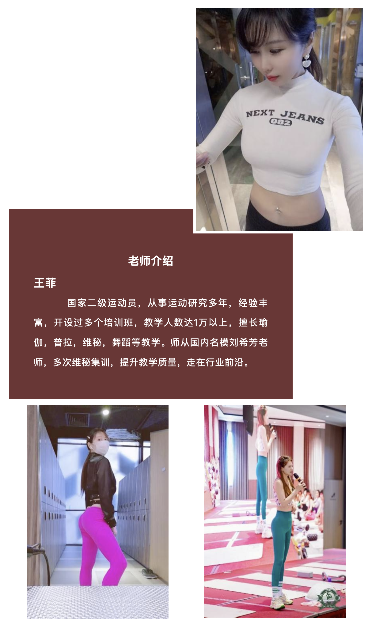 维秘课程是一门自己独立的教学体系。维秘独有八大系列课程是根据维秘定律学、维秘运动学、身材比例人体学、身材肌肉原理及精准发力配比而制定的打造完美身材比例的课程。融入维秘体态、气质美学。